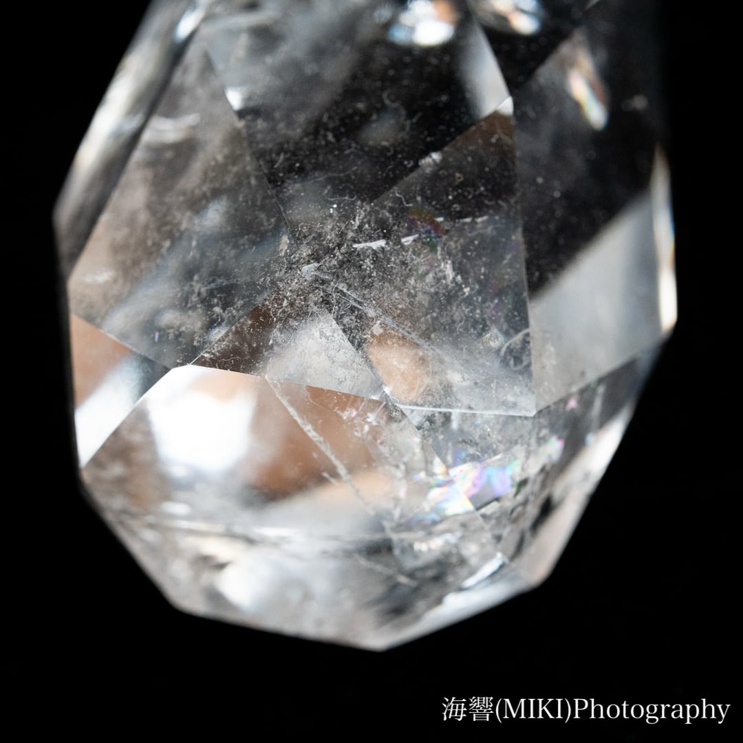 全体に施された多面のカットのドロップ型クォーツ(水晶)です。