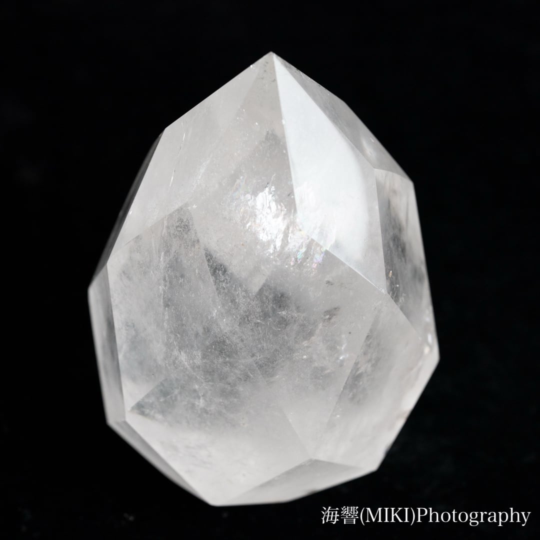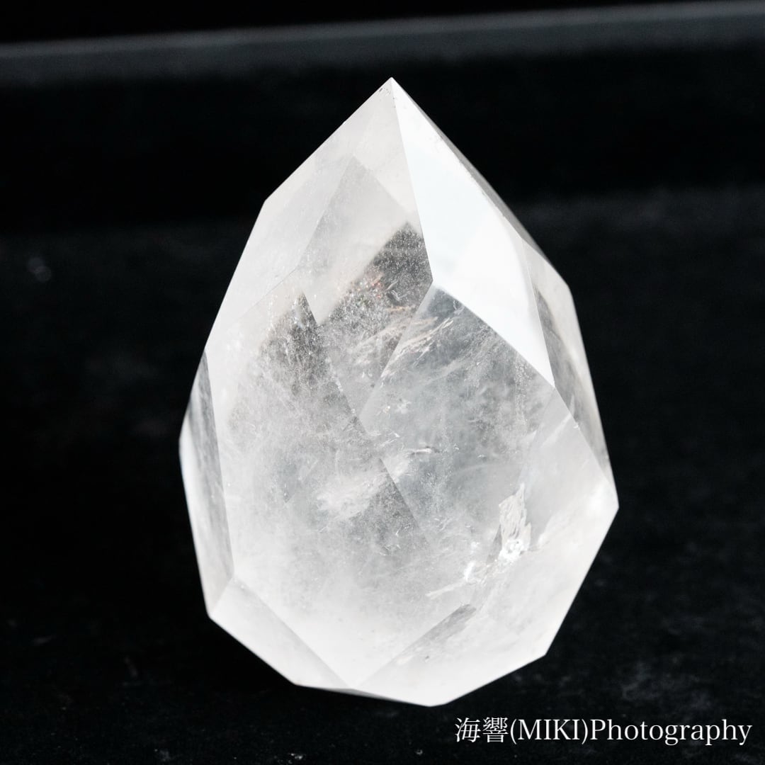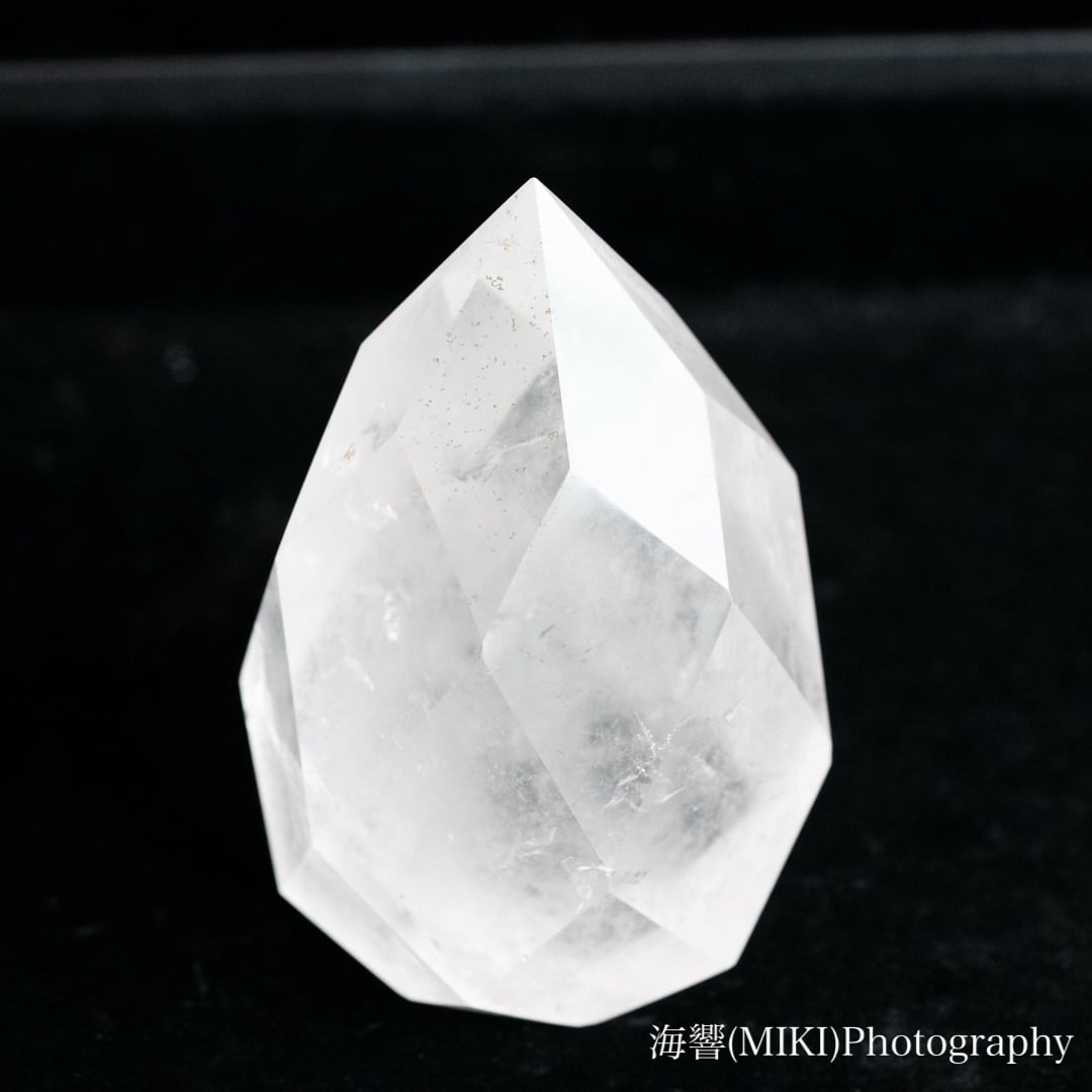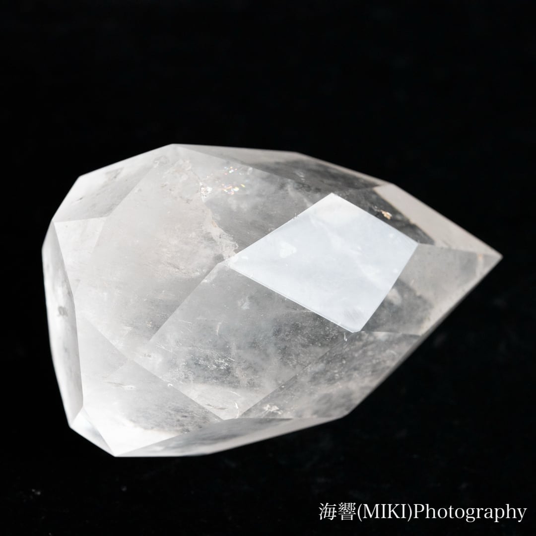 全体に施された多面のカットのドロップ型クォーツ(水晶)です。