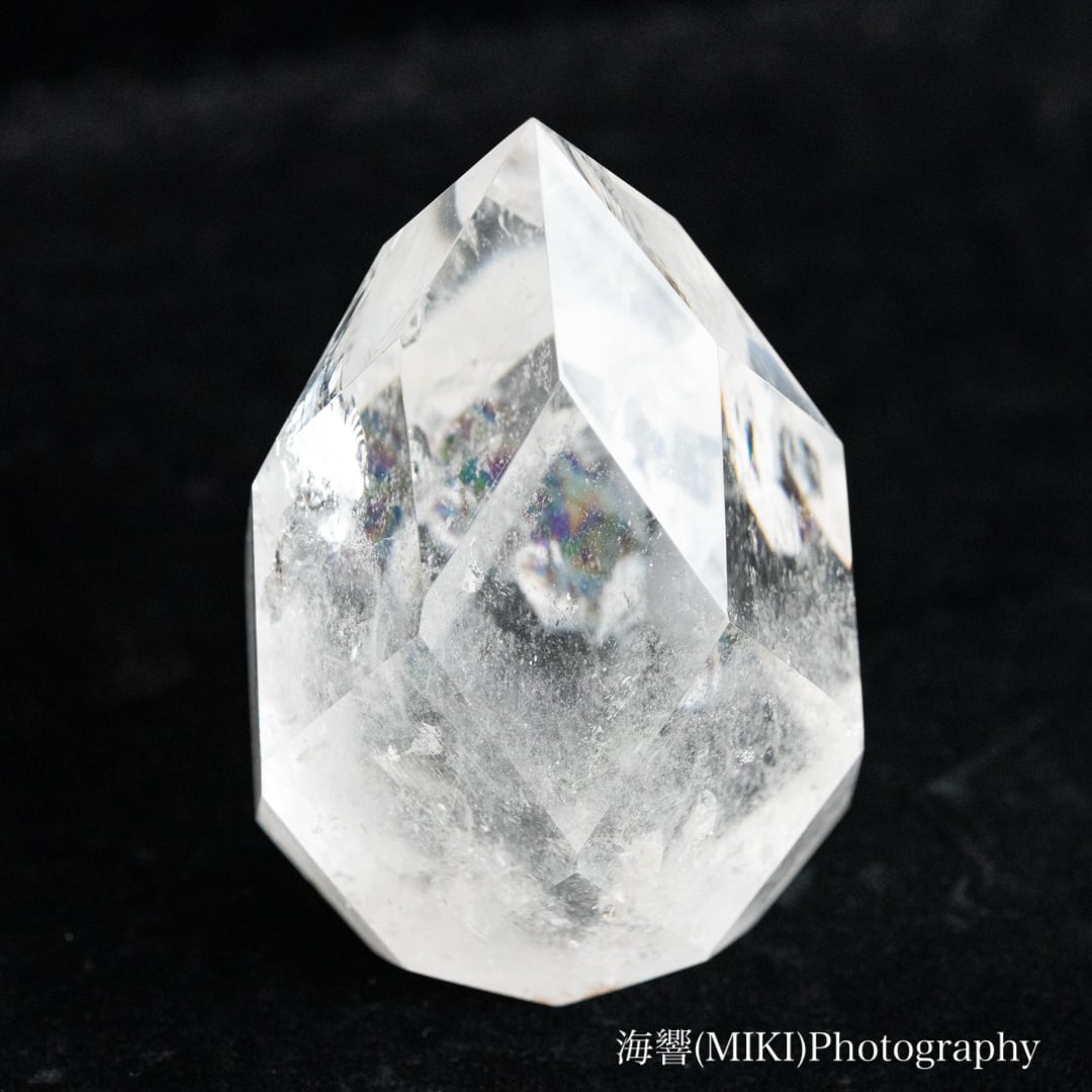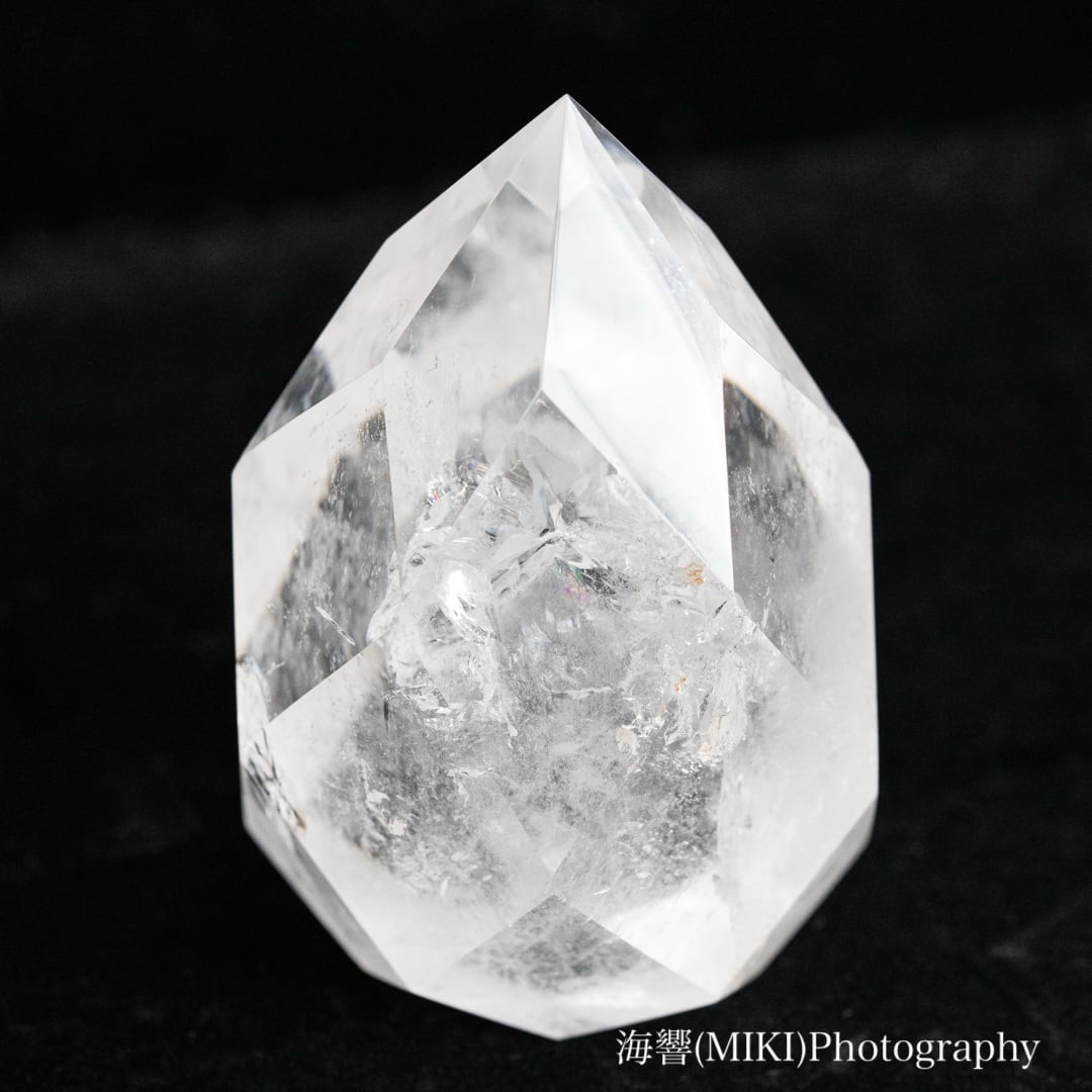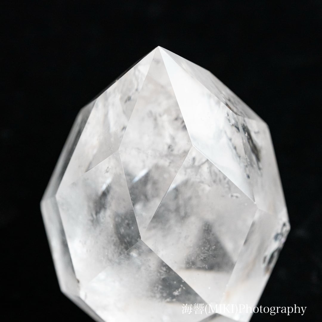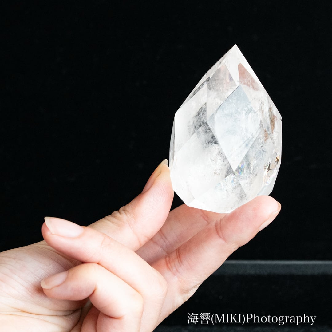 全体に施された多面カットのドロップ型クォーツ(水晶)です。