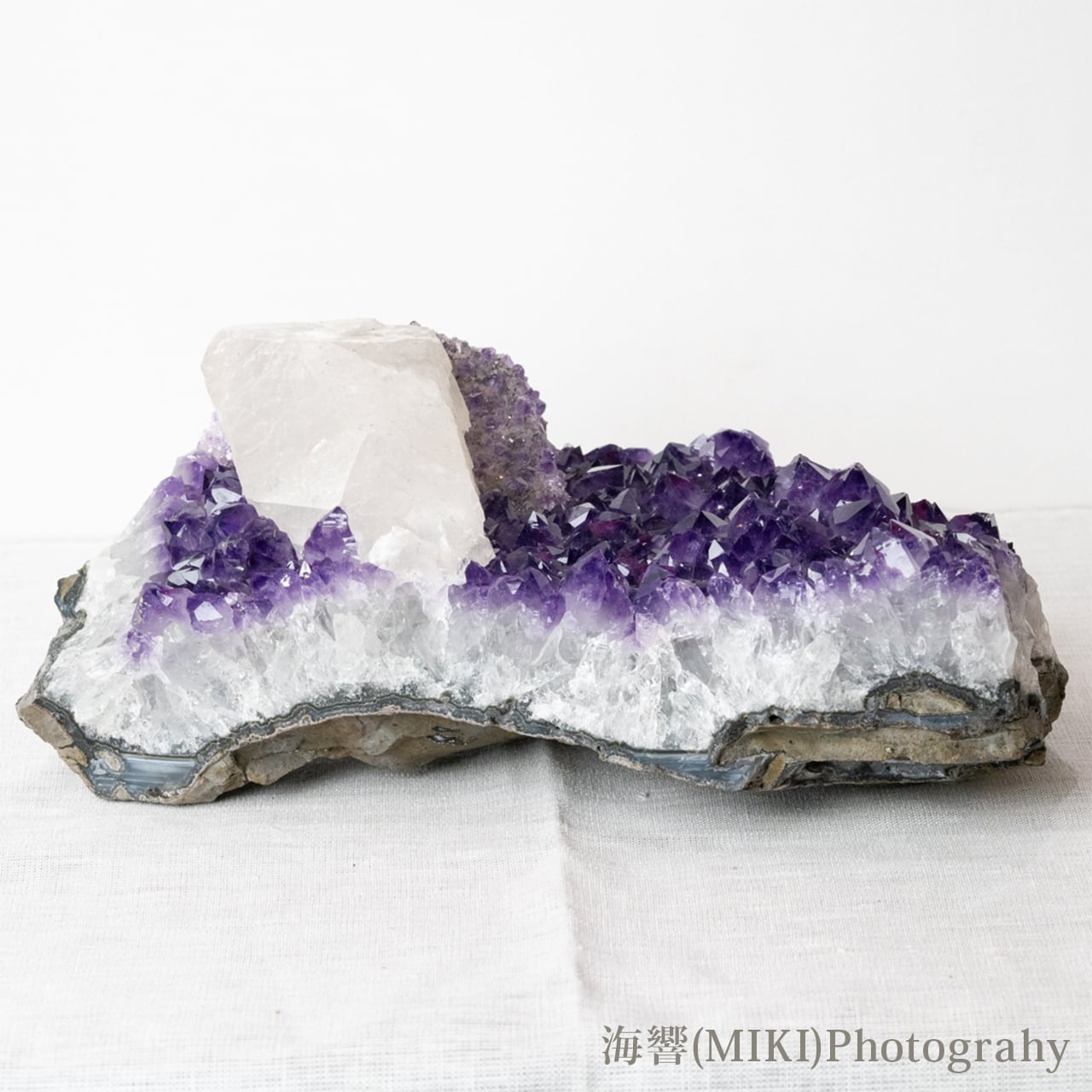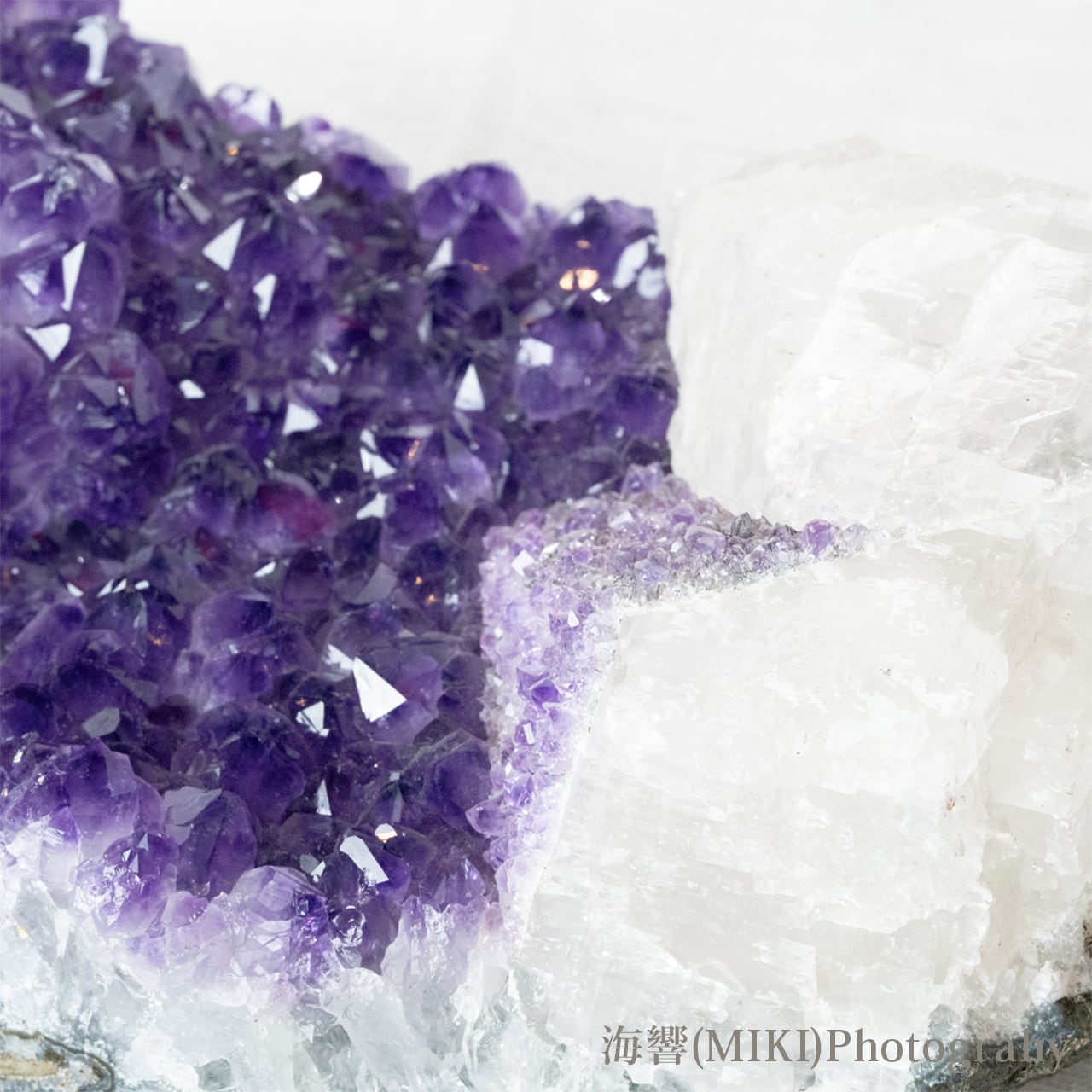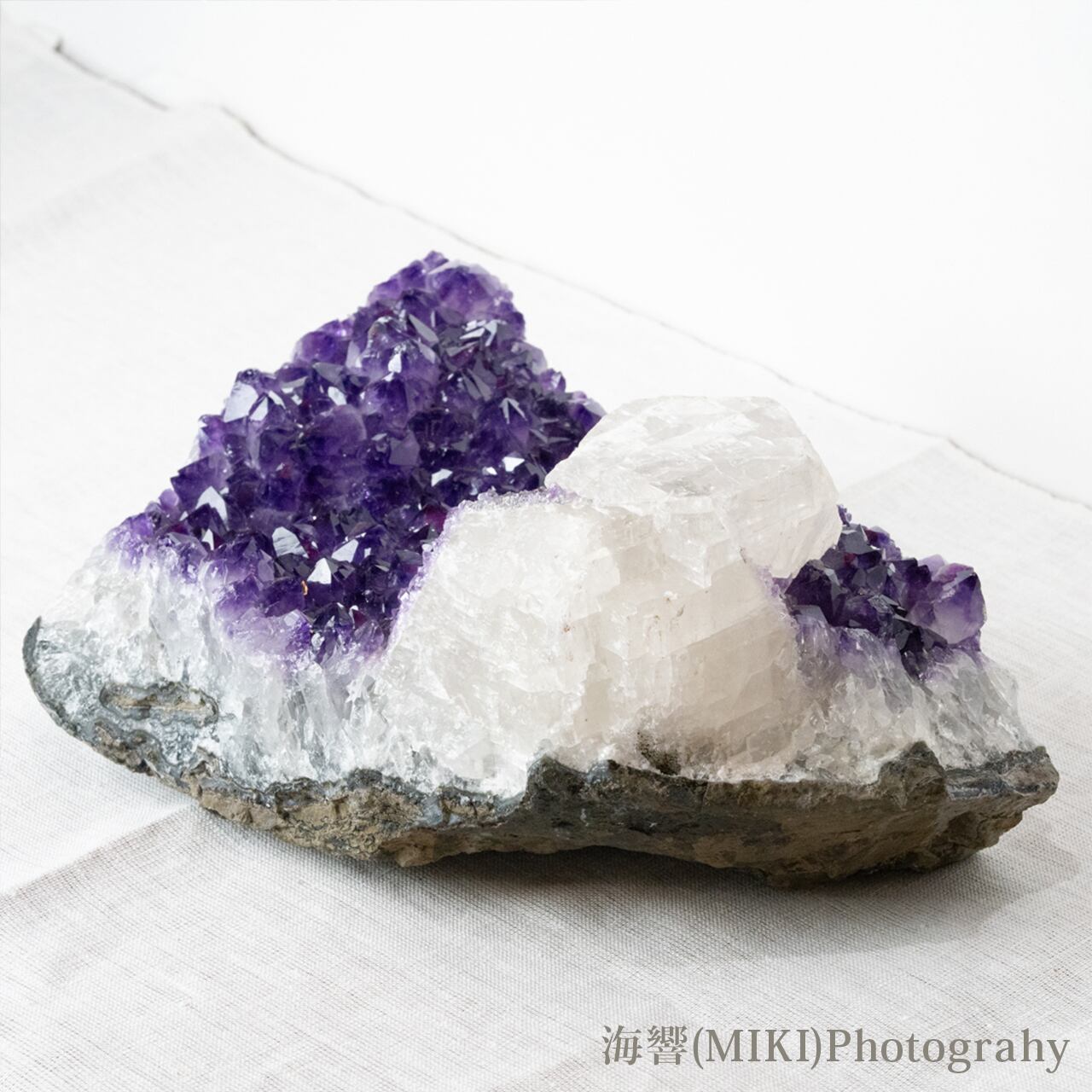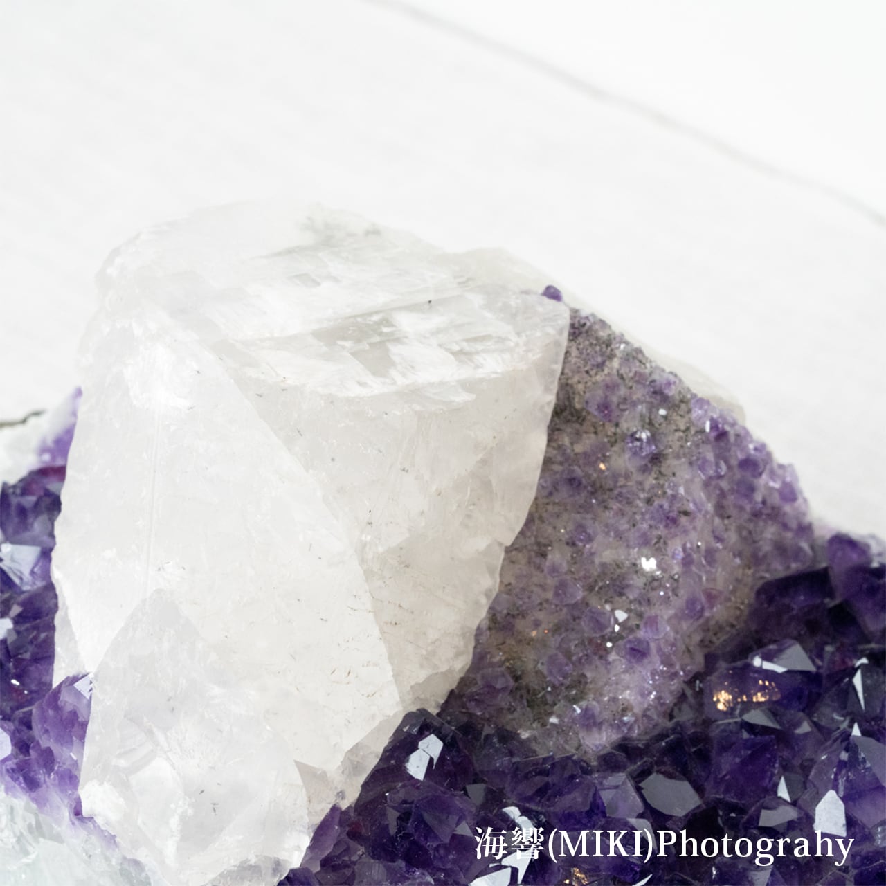存在感のある大きなカルサイトが共生した、希少性の高いアメジスト。