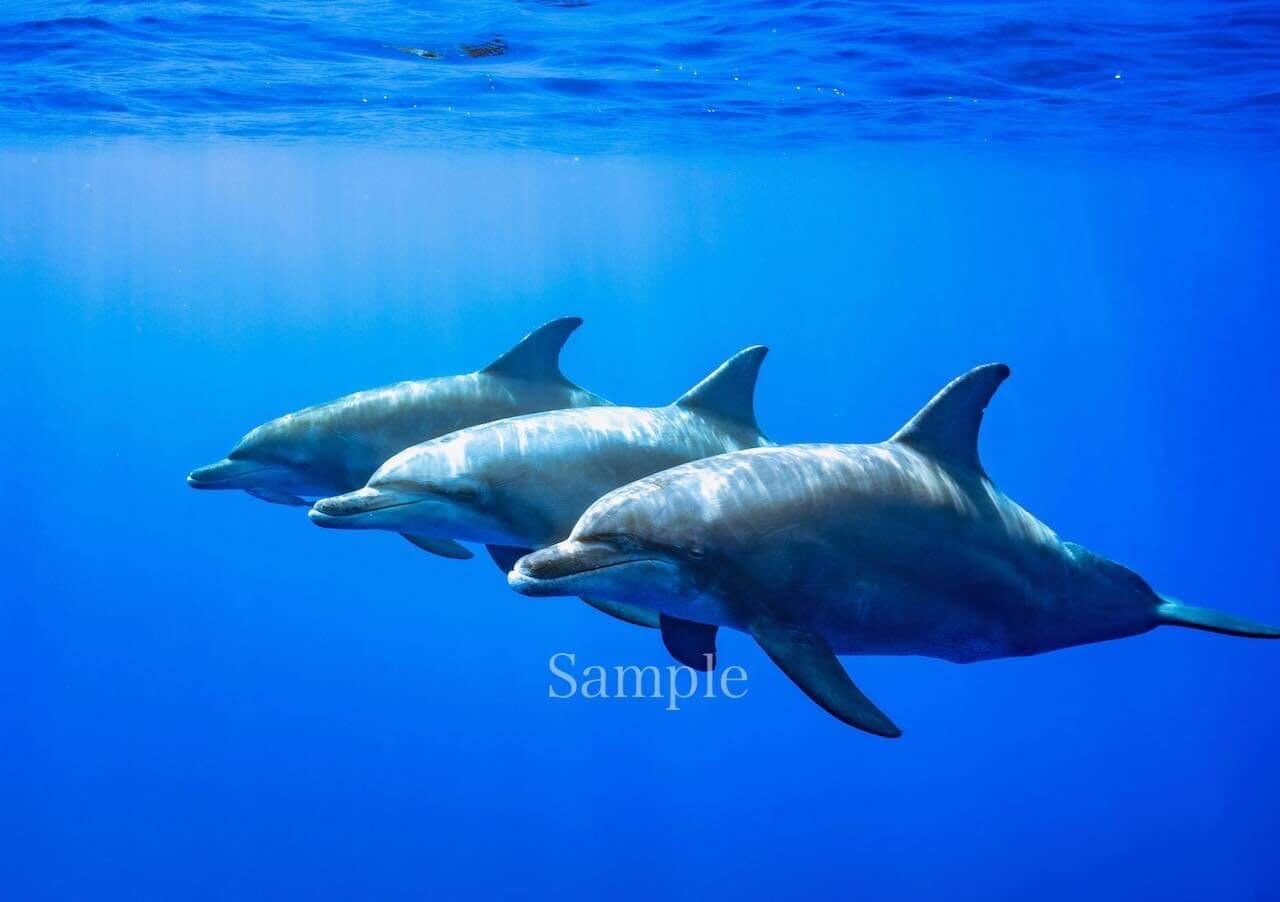 この写真は、小笠原の海のきれいさと、3頭のイルカの調和を表しています。