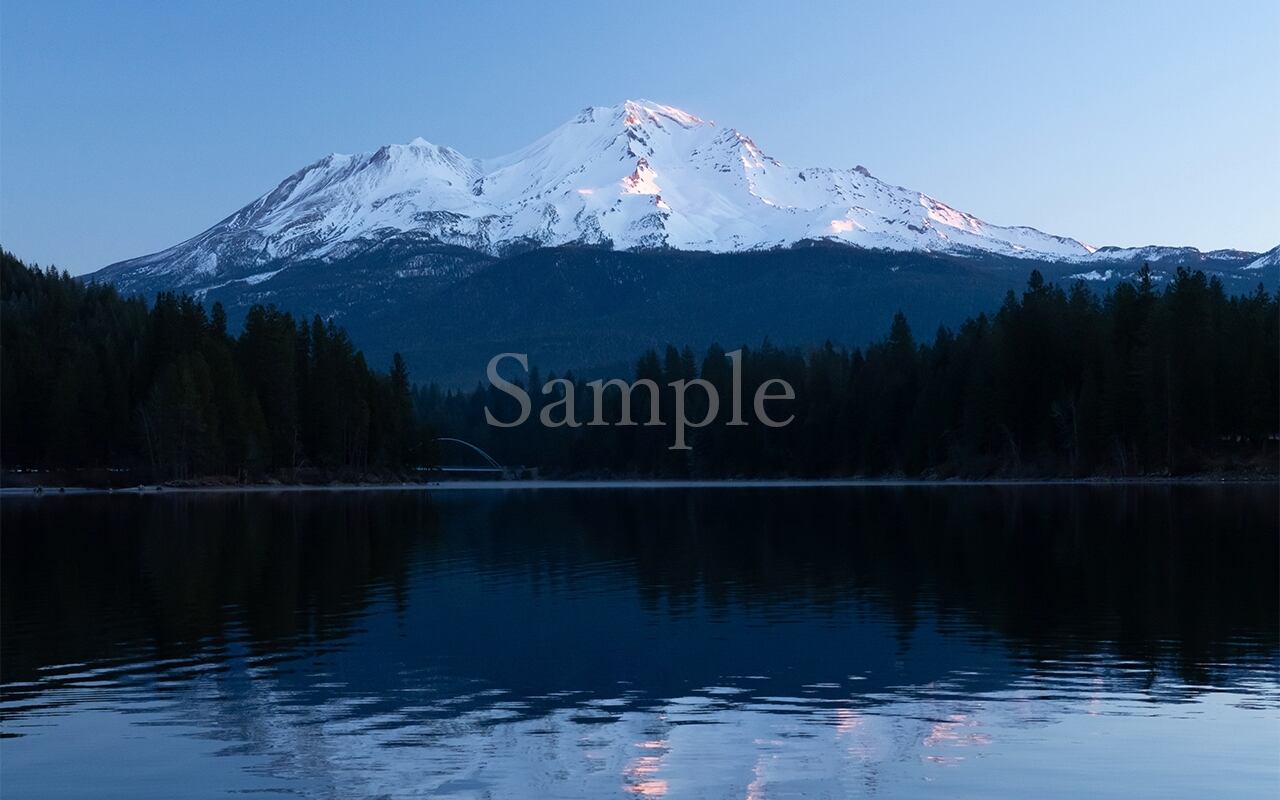 湖面に鏡のようにシャスタ山が映り込んでいるのも美しい、静寂さを感じる作品です。